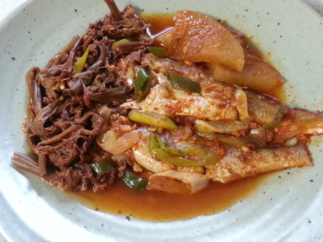 Ini adalah Jogi Jjigae (Sup Ikan Jurel) yang dibuat pedas dan lezat dengan tambahan pakis kering. Sup ini memiliki rasa gurih yang dalam yang menjadikannya ‘pencuri nasi’ sejati, sangat lezat. Sempurna untuk saat Anda kehilangan nafsu makan, kuahnya yang kaya akan membangkitkan selera Anda!
