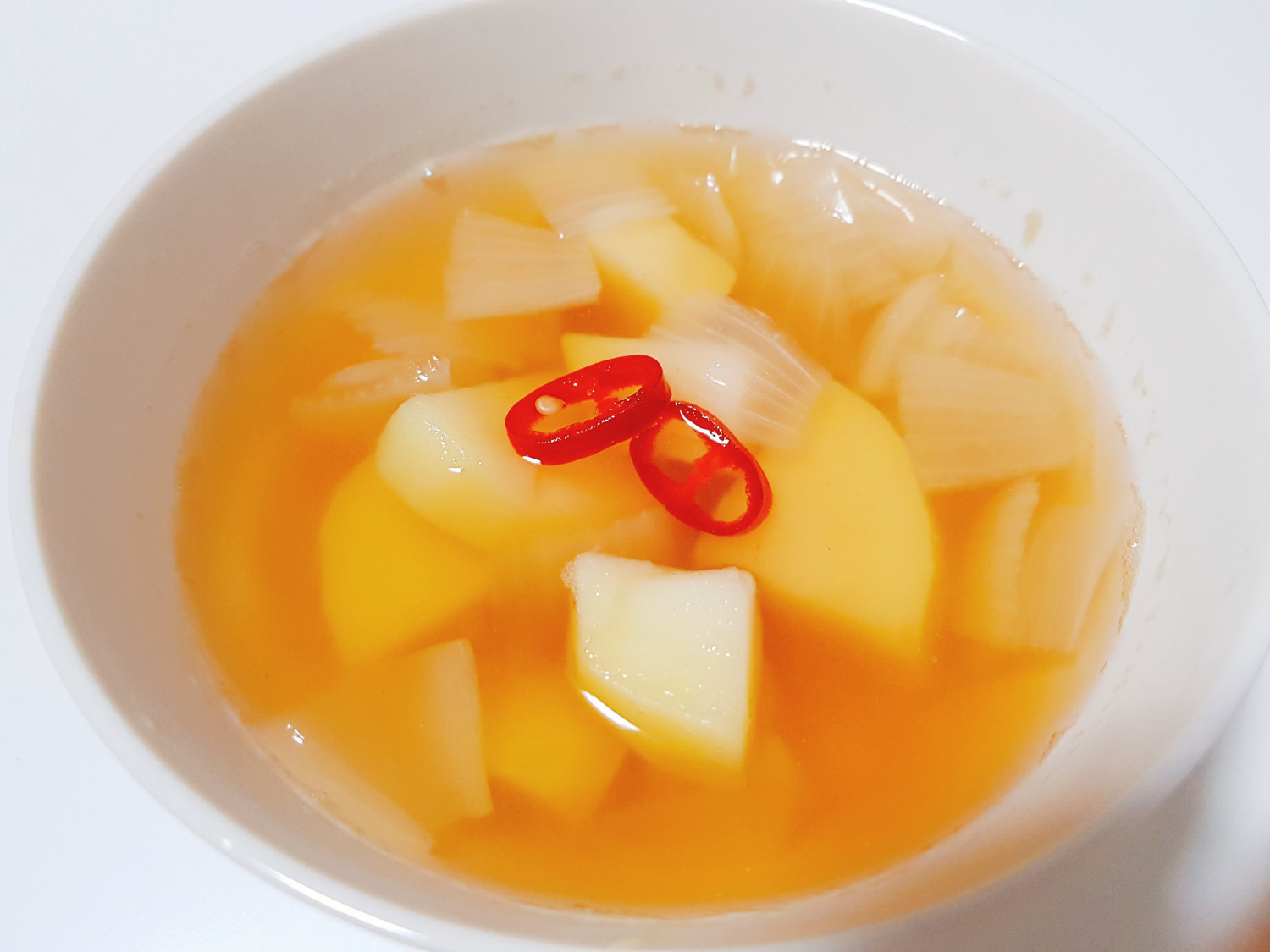 Saat kentang hampir matang, masukkan irisan cabai rawit hijau dan masak sebentar lagi. Terakhir, sesuaikan rasa keseluruhan dengan garam. Karena sudah ada rasa dari kecap asin, sebaiknya tambahkan garam sedikit demi sedikit sambil mencicipi. Sajikan sup kentang panas dalam mangkuk dan nikmati!