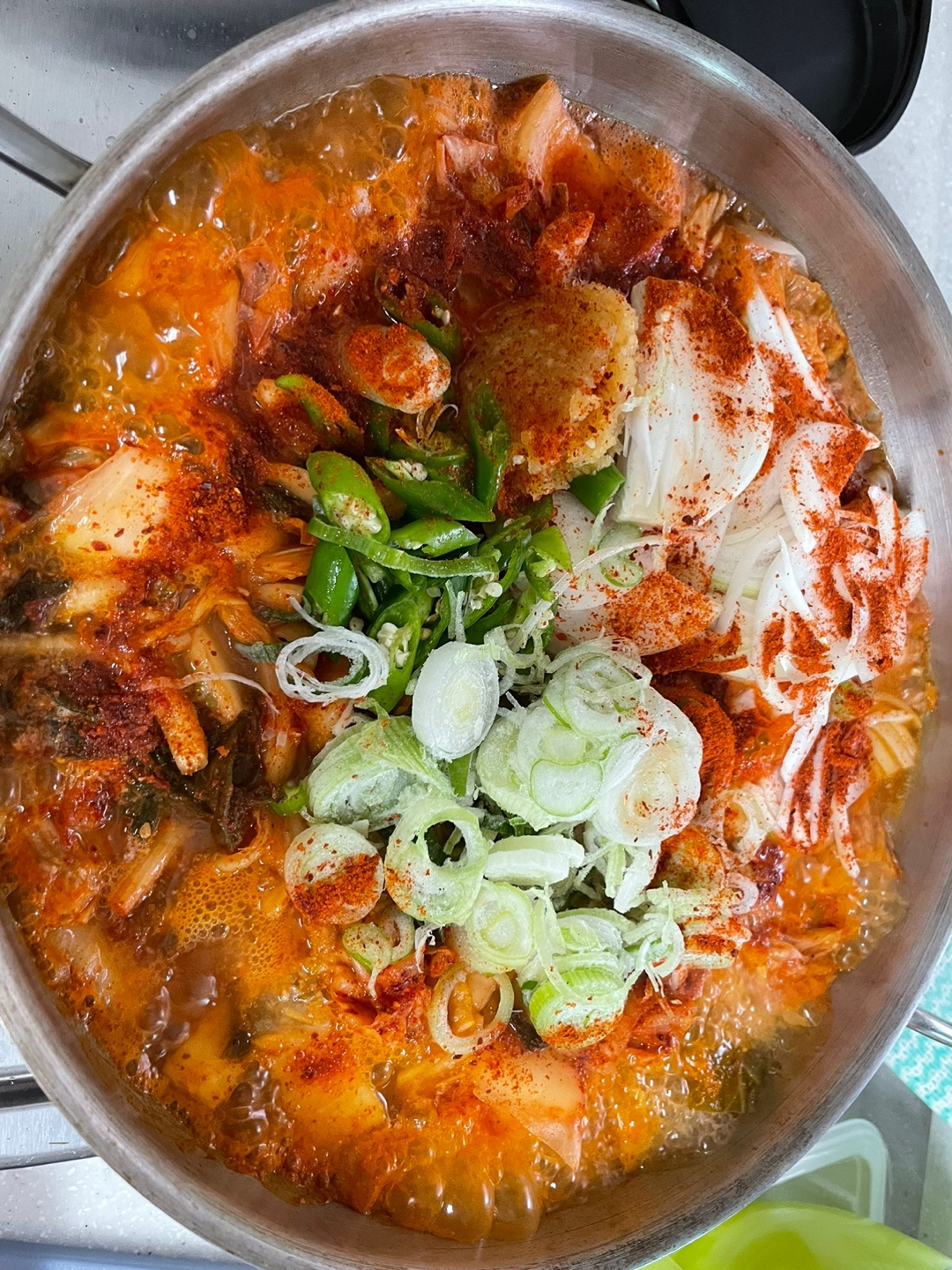 Dalam panci yang dalam, campurkan kimchi yang sudah dipotong, daging babi, dan irisan bawang bombay. Tuangkan air (atau kaldu) secukupnya hingga bahan terendam dengan baik. Nyalakan api besar dan didihkan. Setelah mendidih, tambahkan cabai Cheongyang, daun bawang, bawang putih cincang, gochugaru, dan gula yang sudah disiapkan.