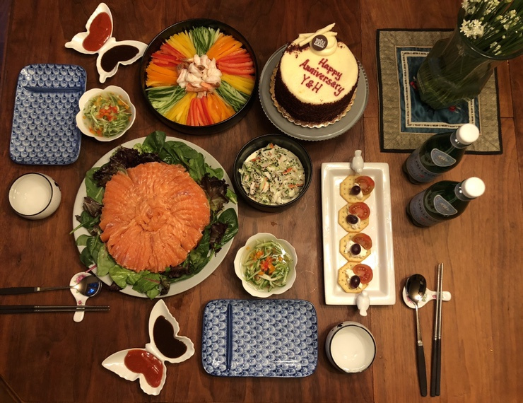Karena kesulitan makan di luar akibat pandemi, saya menyiapkan hidangan spesial di rumah untuk suami dan saya rayakan hari jadi pernikahan kami. Kami memutuskan untuk menciptakan pengalaman seperti di restoran di rumah kami sendiri dengan hidangan yang disiapkan dengan cermat.