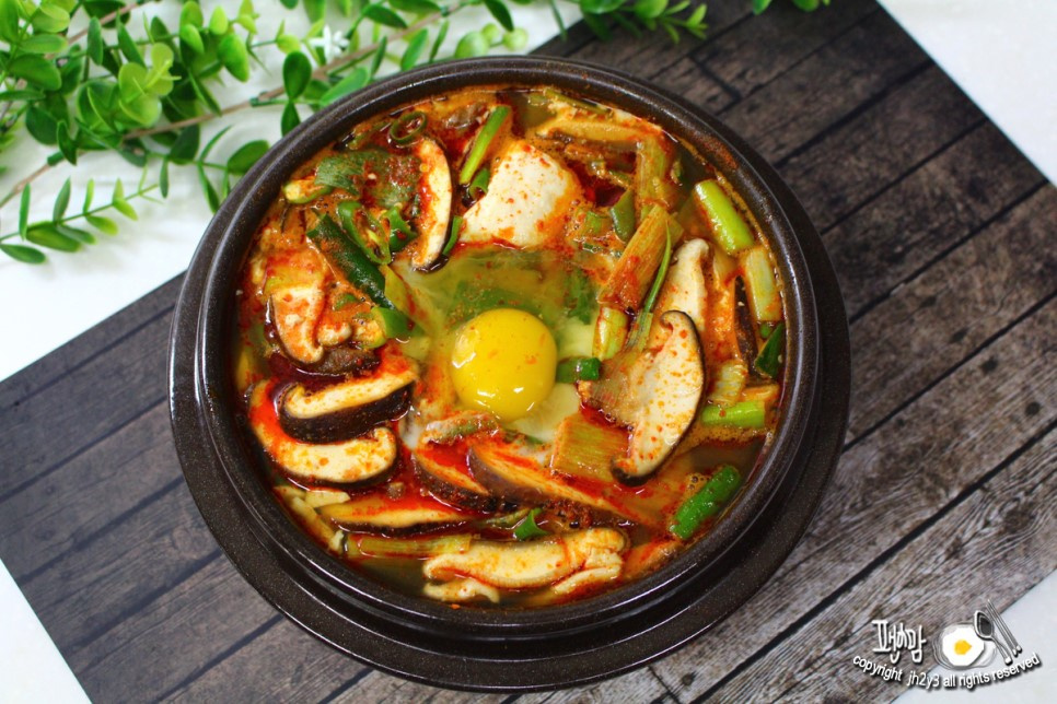 Saatnya menambahkan tahu sutra, jamur shiitake, daun bawang, dan cabai Cheongyang. Biarkan semuanya mendidih perlahan hingga matang. Tepat sebelum disajikan, pecahkan 1 telur langsung ke dalam sup yang mendidih. Telur akan matang perlahan dalam kuah panas, menambah kekayaan rasa. Setelah telur matang, matikan api dan sajikan segera.