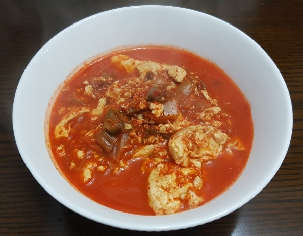 Tuang 2-3 cangkir (menggunakan cangkir kertas sebagai takaran) air ke dalam panci berisi tumisan bahan dan didihkan. Setelah mendidih, masukkan seluruh tahu sutra dari bungkusnya dan pecah-pecah menjadi 2-3 bagian besar dengan sendok. Kemudian, tambahkan cabai Cheongyang yang diiris serong dan daun bawang yang diiris. Terakhir, tambahkan 1 sdm bawang putih cincang dan biarkan mendidih sebentar lagi. Cicipi supnya dan tambahkan garam jika perlu untuk menyesuaikan rasa. Anda juga bisa menambahkan sejumput lada hitam jika suka.