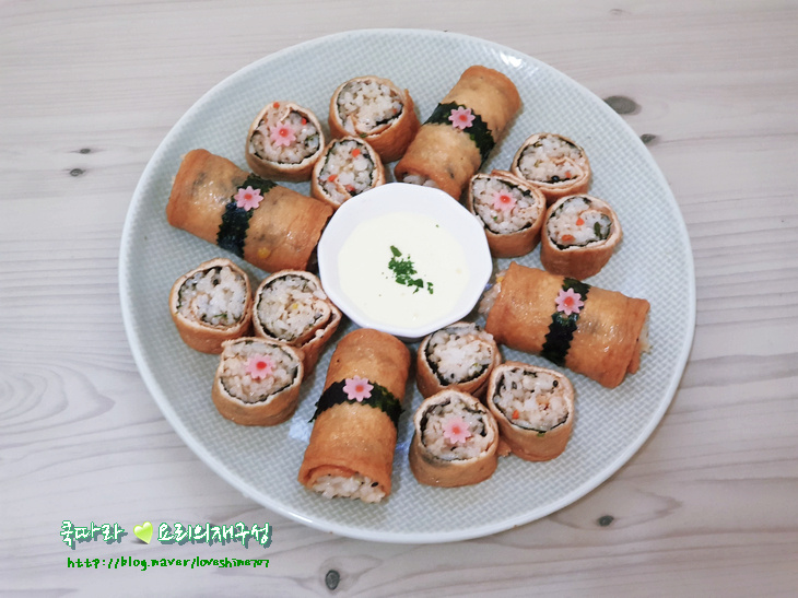 Ingin membuatnya lebih cantik sebelum dikemas ke dalam kotak bekal? Lingkarkan seutas rumput laut bekal di bagian tengah setiap sushi inari gulung. Untuk sentuhan yang lebih menarik, potong bentuk-bentuk kecil seperti bunga atau hati dari sosis olahan dan tempelkan pada lilitan rumput laut. Tambahkan sedikit saus tomat di tengah bunga sosis untuk aksen yang cerah. Sushi ini bisa dinikmati langsung, atau untuk memudahkan makan, potong setiap gulungan menjadi tiga bagian seukuran sekali gigit. Ini akan menjadi menu bekal yang praktis dan lezat!