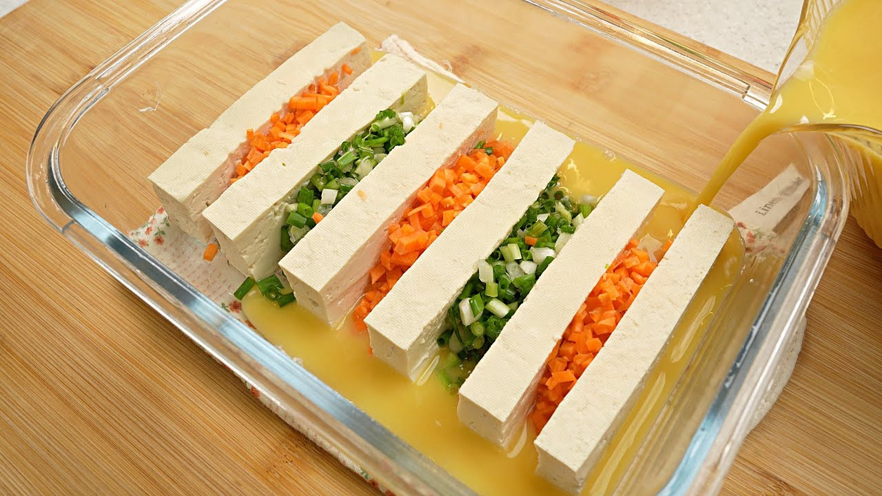 Siapkan wadah tahan microwave yang dalam. Susun potongan tahu dengan rapi di dasar wadah. Taburkan secara merata potongan wortel dan irisan daun bawang di atas tahu.