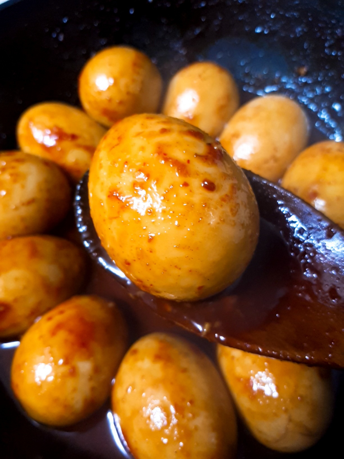 Telur rebus pedas manis yang lezat! Sempurna dicampur dengan nasi, apalagi dengan kuahnya!