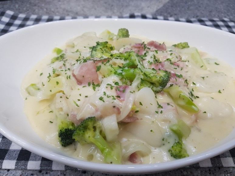 Pertama, siapkan bumbu aromatik dan sayuran Anda. Cincang halus atau iris tipis bawang putih. Cincang halus bawang bombay. Potong brokoli menjadi kuntum-kuntum kecil seukuran sekali gigit. Iris bacon menjadi potongan berukuran 1 cm. Cuci kue beras tteokguk di bawah air dingin agar tidak saling menempel.