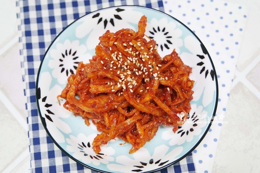 Jinmichae Bokkeum ini adalah lauk khas Korea yang sangat disukai, rasanya pedas, manis, dan kenyal, menjadikannya pendamping nasi yang sempurna. Dibuat dengan saus gochujang (pasta cabai Korea) yang sederhana, sangat mudah dibuat oleh siapa saja dan sangat serbaguna sebagai banchan (lauk pendamping). Teksturnya yang kenyal berpadu dengan saus yang membuat ketagihan akan membuat semua orang, dari anak-anak hingga orang dewasa, menginginkannya lagi!