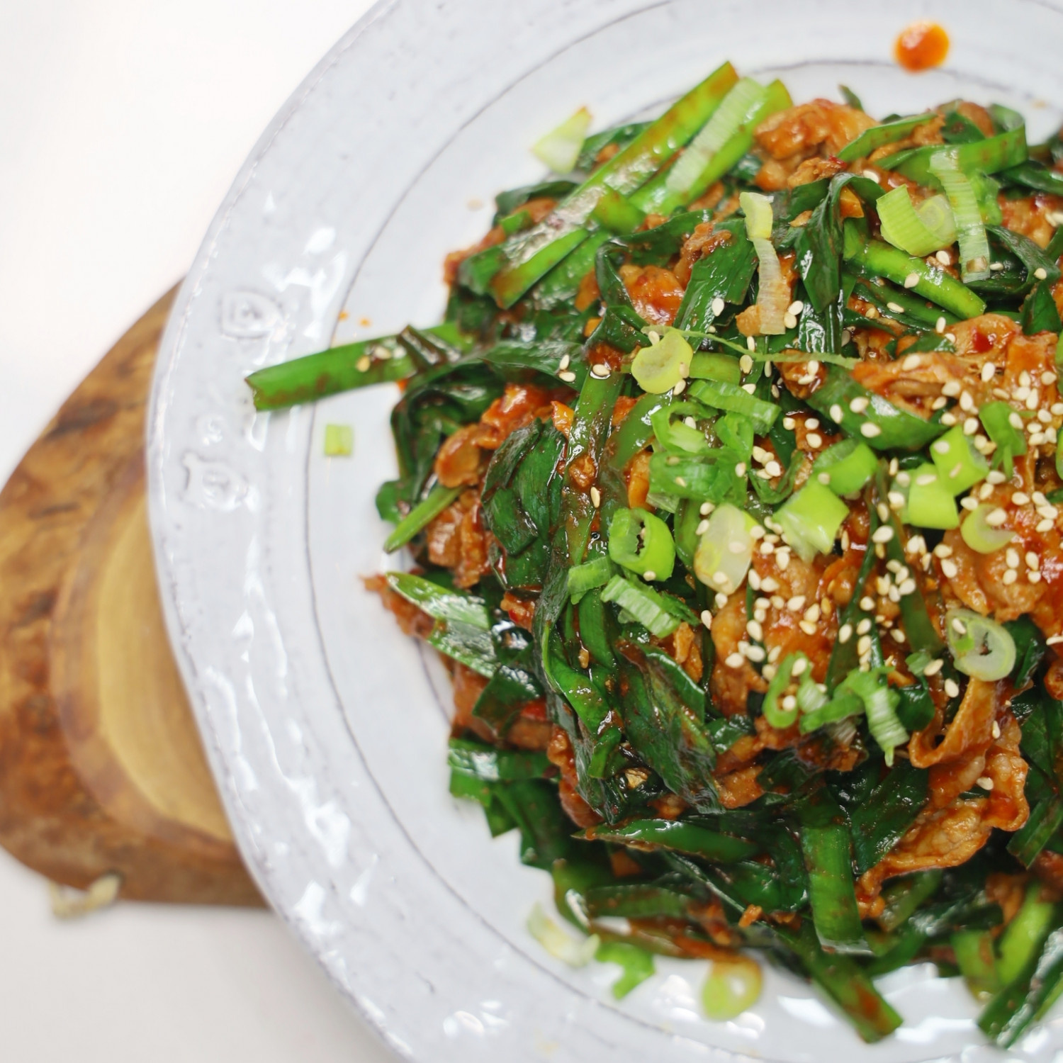 Daun kucai, dengan aroma khasnya yang lembut namun tegas dan teksturnya yang renyah, adalah bahan serbaguna yang dapat menyeimbangkan kekayaan rasa daging. Meskipun bukan rempah yang kuat, rasa pedasnya yang khas dan lembut menjadikannya tambahan yang fantastis untuk hidangan daging, memotong rasa berminyak dan meningkatkan harmoni keseluruhan. Saya sering menambahkan daun kucai di akhir memasak hidangan seperti sup ayam untuk menambah rasa dan tekstur, dan saya sangat suka menggunakannya dalam berbagai tumisan. Daun kucai memberikan sentuhan rasa Tiongkok yang menyenangkan pada hidangan tumisan, yang menurut saya sangat menarik. Hari ini, kita akan membuat tumisan daging babi dengan daun kucai yang sederhana namun lezat, menggunakan saus spesial yang memadukan Gochujang (pasta cabai Korea) dengan sedikit Doubanjiang (pasta kacang lebar Tiongkok) untuk lapisan rasa tambahan yang terinspirasi dari Tiongkok. Ayo mulai memasak!