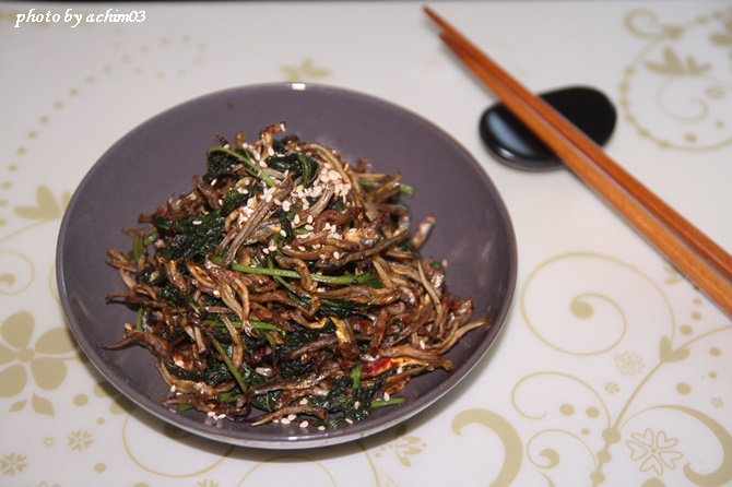 Tambahkan ikan teri rendah garam ke dalam wajan bersama daun perilla yang sudah layu. Aduk cepat hingga tercampur rata.