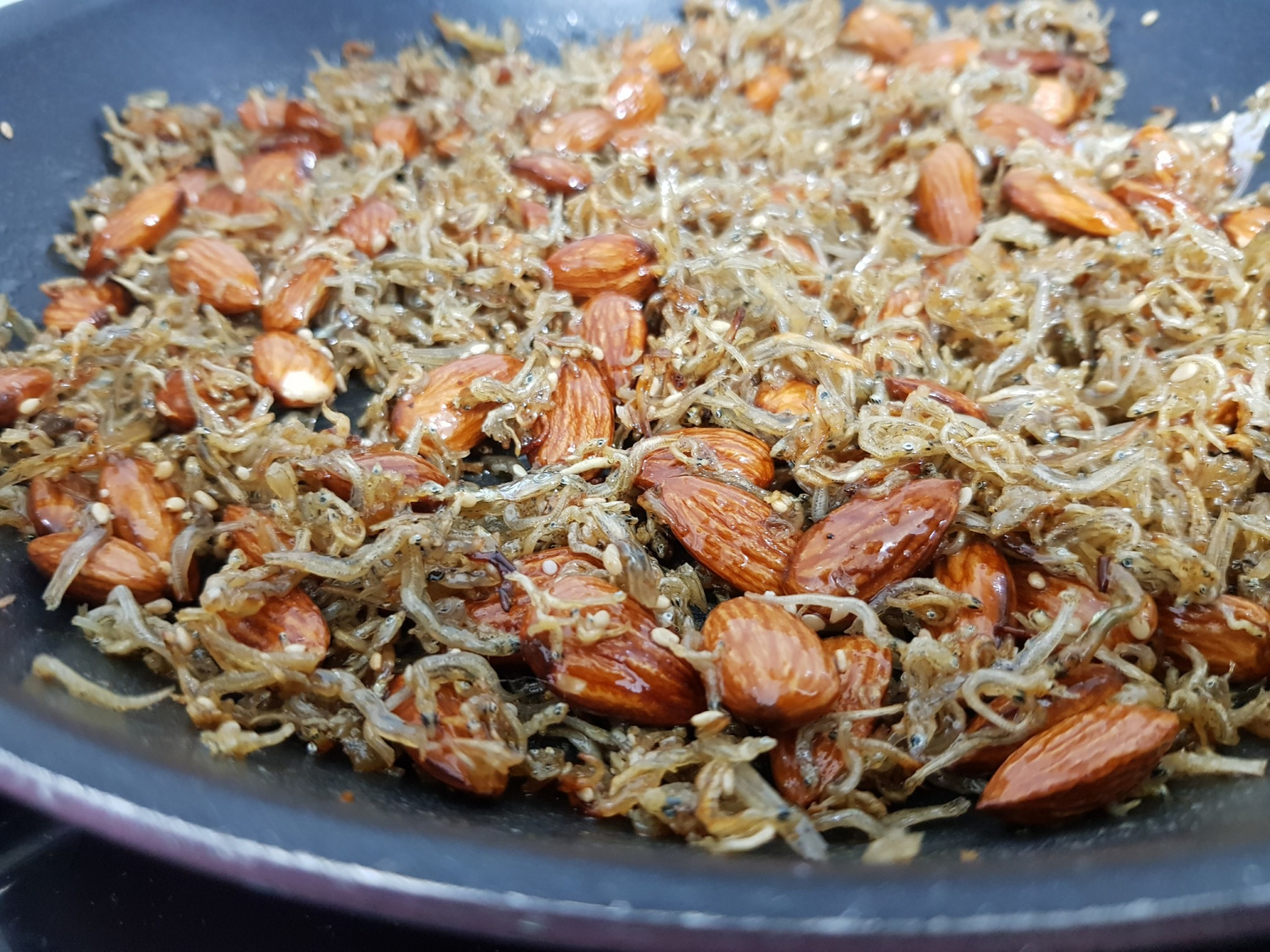 Terakhir, taburkan 1 genggam biji wijen atau wijen sangrai. Segera aduk rata menggunakan sisa panas untuk melapisi ikan teri dan almond secara merata tanpa gosong. Hati-hati jangan sampai terlalu matang dengan api kecil, karena ini bisa membuat ikan teri menjadi terlalu keras. Sebaiknya matikan api dan selesaikan dengan mengaduk sebentar dengan sisa panas.