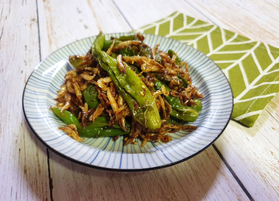Kami membuat tumisan lezat dan gurih dengan udang kecil kering dan paprika hijau (kwari gochu). Hidangan ini sangat cocok sebagai lauk pendamping yang simpel dan penuh rasa umami. Kombinasi tekstur dan rasanya sangat menggugah selera.