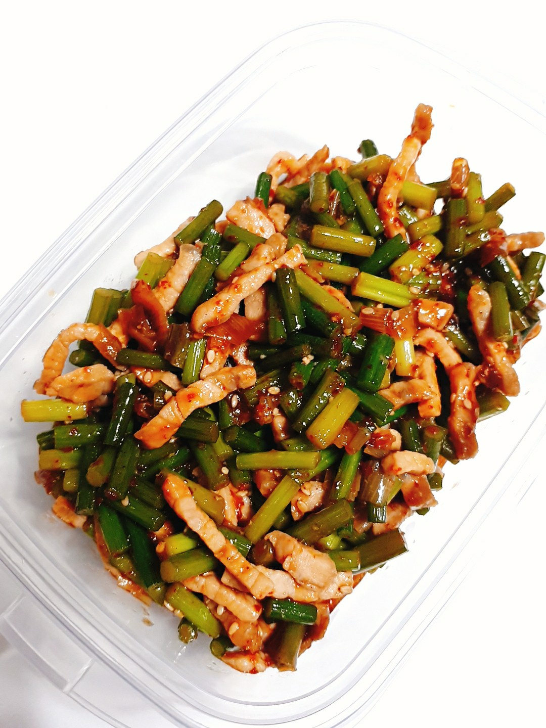 Setelah daging babi hampir matang, tambahkan rebung bawang putih yang sudah dipotong dan semua bumbu (gochugaru, saus tiram, kecap asin, oligosakarida) ke dalam wajan. Aduk rata semuanya. Jika campuran terlihat terlalu kering selama memasak, tambahkan 2-3 sendok makan air untuk melembapkannya. Sesuaikan jumlah oligosakarida sesuai selera Anda untuk tingkat kemanisan. Pastikan semua bahan dan bumbu tercampur rata.