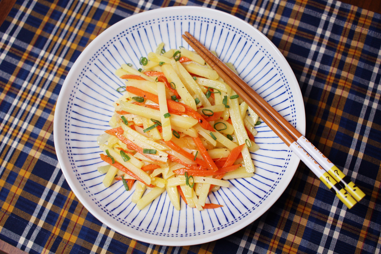 Pertama, cuci dan siapkan kentang, bawang bombay, dan wortel. Kupas kentang (atau cuci bersih jika Anda lebih suka kulitnya) dan potong memanjang menjadi irisan sekitar 3-5 cm. Iris bawang bombay serupa, dan potong wortel memanjang dengan ketebalan yang sama dengan kentang untuk warna. Jika wortel terlalu tebal, teksturnya mungkin terasa kurang pas, jadi disarankan mengirisnya tipis.