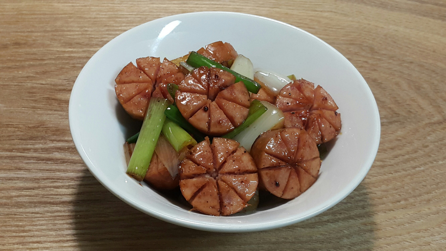 Potong sosis menjadi ukuran sekali suap, sekitar 1 cm tebalnya. Anda bisa membuat torehan di permukaannya untuk pola dekoratif agar terlihat lebih menarik. Iris bawang bombay memanjang dan potong daun bawang menyerong.