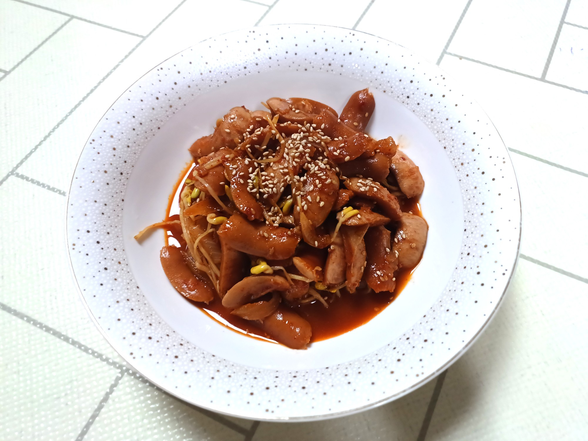 Terakhir, taburi dengan biji wijen sangrai secukupnya. Aduk cepat, dan Tumisan Sosis dan Tauge Anda yang lezat dan mengenyangkan siap disajikan! Ini akan menjadi hidangan utama yang sempurna untuk makanan yang menyenangkan.
