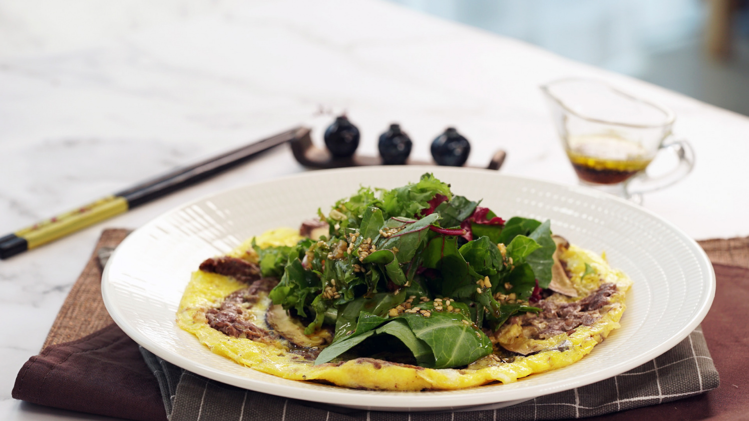 Sekarang saatnya menambahkan adonan telur. Tuangkan campuran telur kocok secara merata di atas daging sapi di wajan. Tata irisan jamur shiitake dari langkah 1 di atasnya. Masak dengan api kecil, biarkan telur matang tanpa merusak Yukjeon. Setelah berwarna cokelat keemasan di satu sisi, balik dengan hati-hati dan masak sisi lainnya hingga matang.