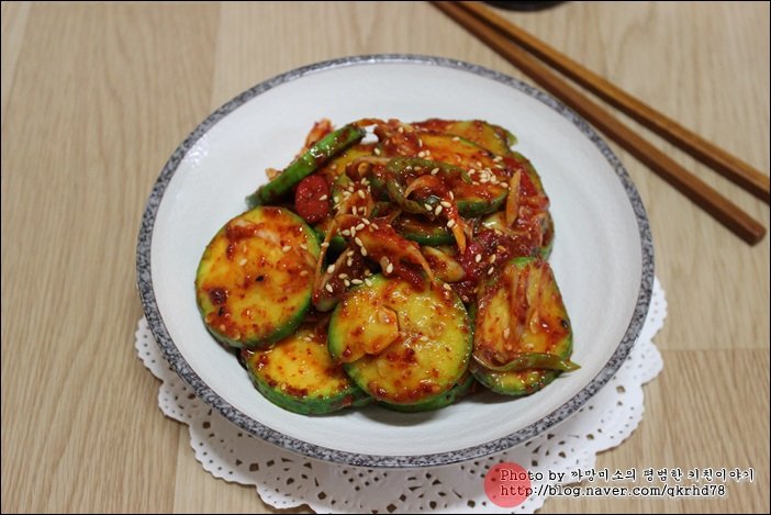 彩りのための赤唐辛子、辛味がお好みなら青唐辛子、そして爽やかな香りの長ネギをみじん切りにしてズッキーニの上に乗せます。次に、「和え衣」の材料をすべて混ぜ合わせ、手で優しく 조물조물(チョムルチョムル:もみほぐす擬音語)するように和えていきます。調味料が全体に均等に馴染むように、優しく混ぜ合わせることが大切です。