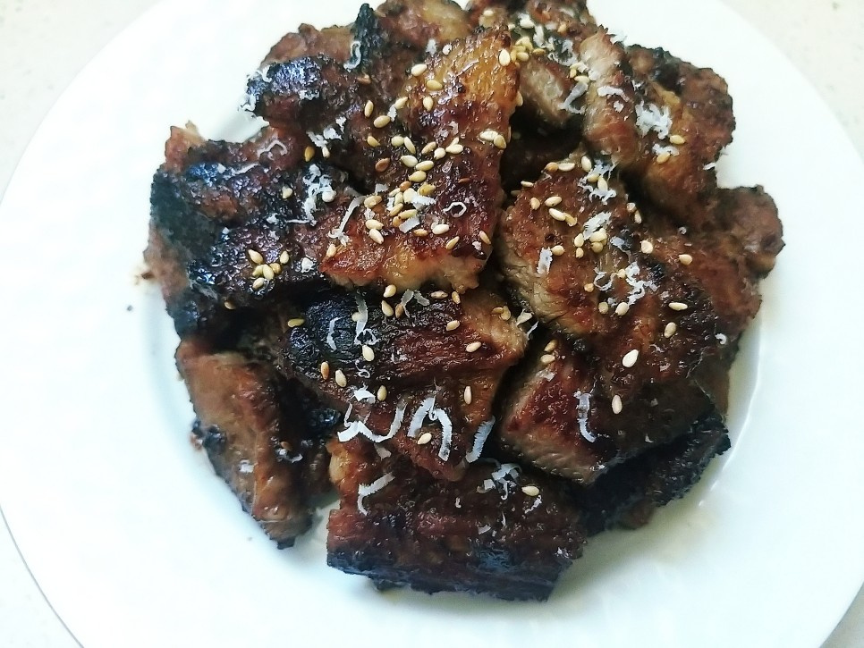 最後に、見た目も美しく風味も香ばしいいりごまをパラパラと振りかけて飾り付ければ、全ての工程が完了です。おうちで本格的に楽しめる豚カルビ、どうぞ召し上がれ!