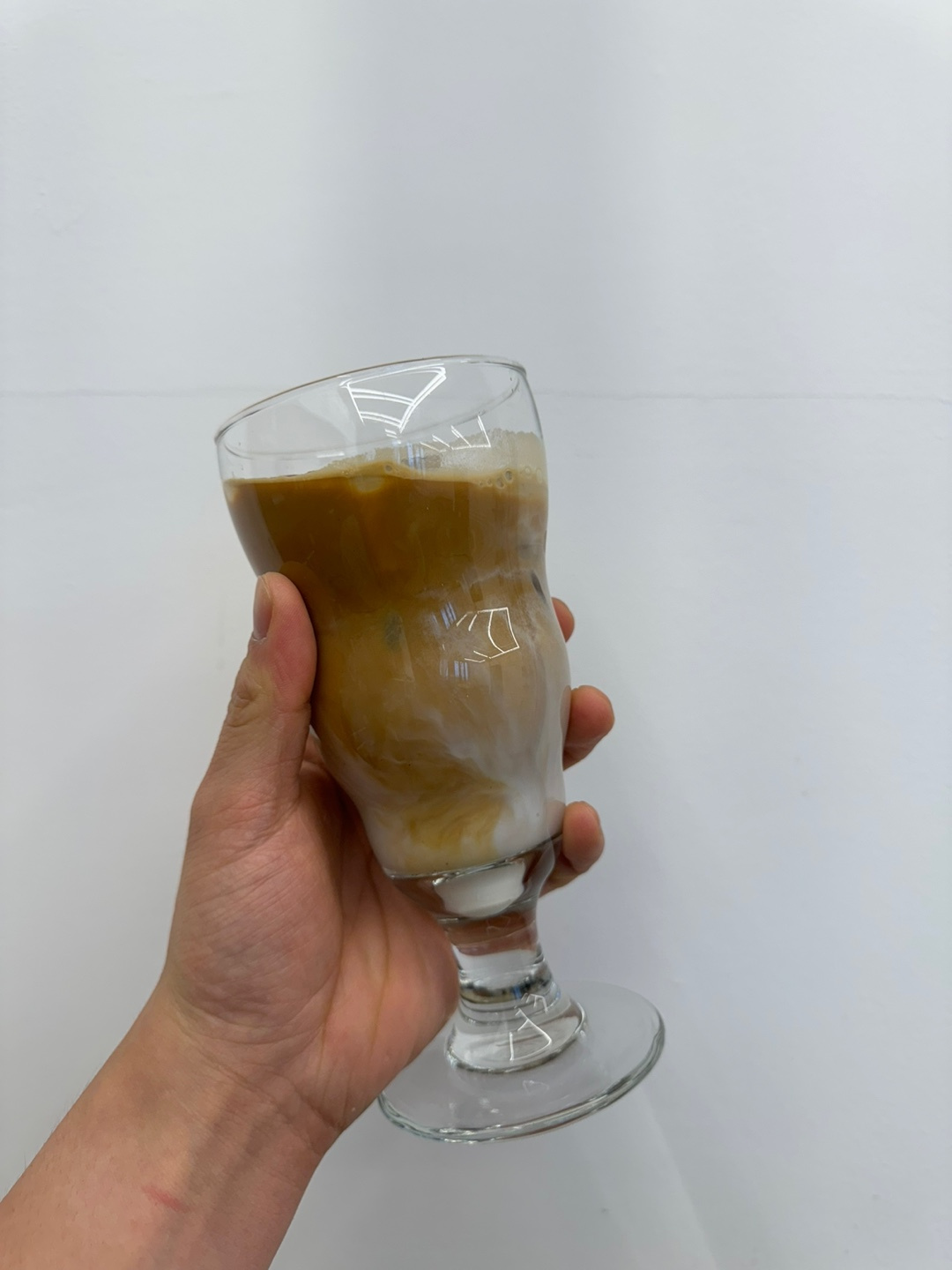 完成です!美味しいアイスカフェラテをお楽しみください。ストローで牛乳とエスプレッソをよく混ぜ合わせ、コーヒーの豊かな風味を堪能しましょう。お好みで、シロップやホイップクリームを加えても美味しいですよ。