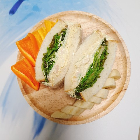 いよいよ組み立てです!食パン1枚の上に、水気を切ったサニーレタスをきれいに並べ、その上にスライスしたキュウリを重ねます。最後に、先ほど作ったクリーミーな卵サラダをたっぷりと乗せ、もう1枚の食パンで蓋をすれば、美味しい卵サンドの完成です!