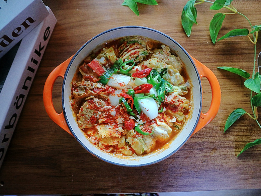 この状態で煮込むと、スープが少なく、チヂミを煮ているような感じになるかもしれません。この時味見をすると、少し塩辛く感じることがあります。