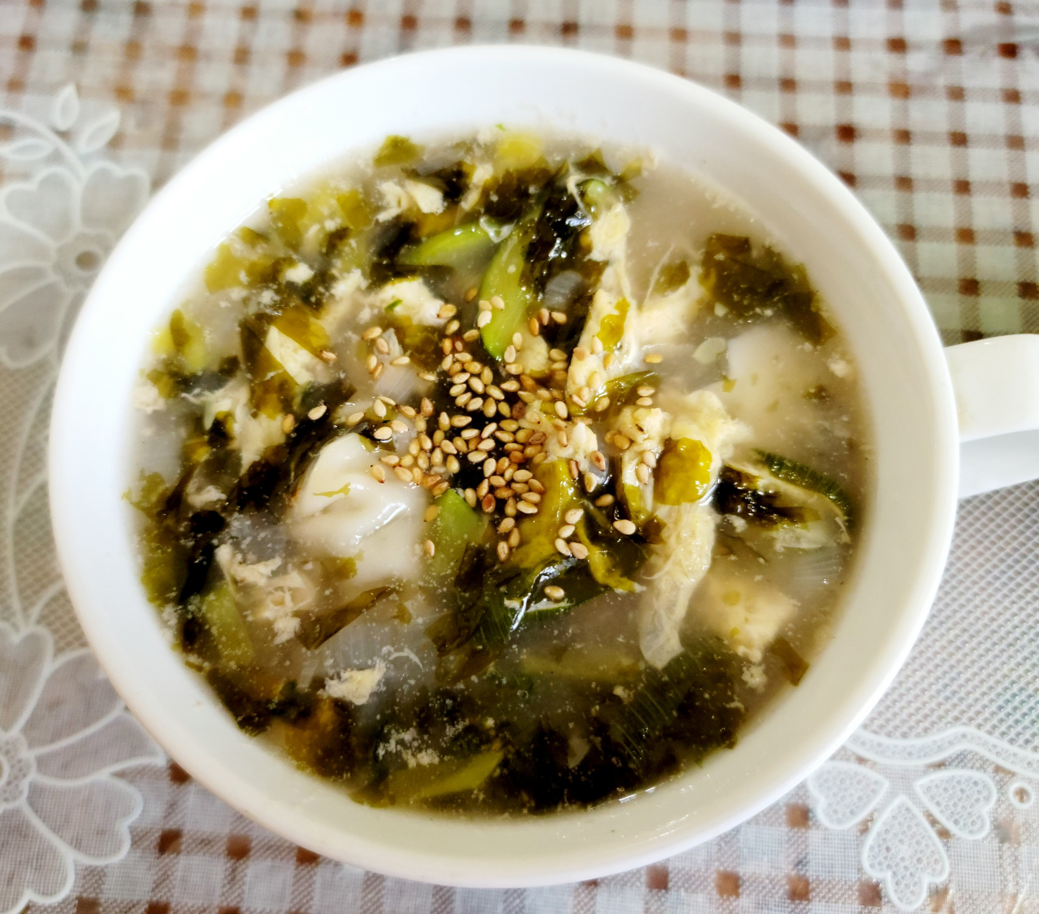 卵がきれいに固まったら、乾海苔4枚を指で粗くちぎってトッククの上に散らします。海苔がスープと混ざり合い、独特の旨味を醸し出します。お好みでこしょうをさらに加え、火を止めます。最後に塩で最終的な味を調え、温かいまま完成させます。