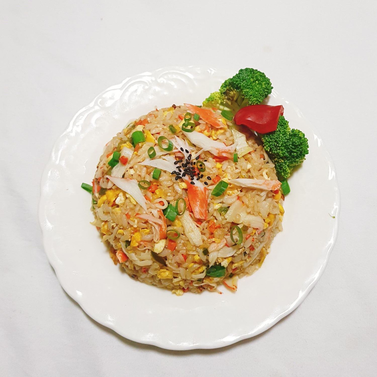 温かく食欲をそそるかにかま炒飯を、お好みの器にきれいに盛り付けてください。見栄えの良い一食があなたを待っています!どうぞ美味しくお召し上がりください!