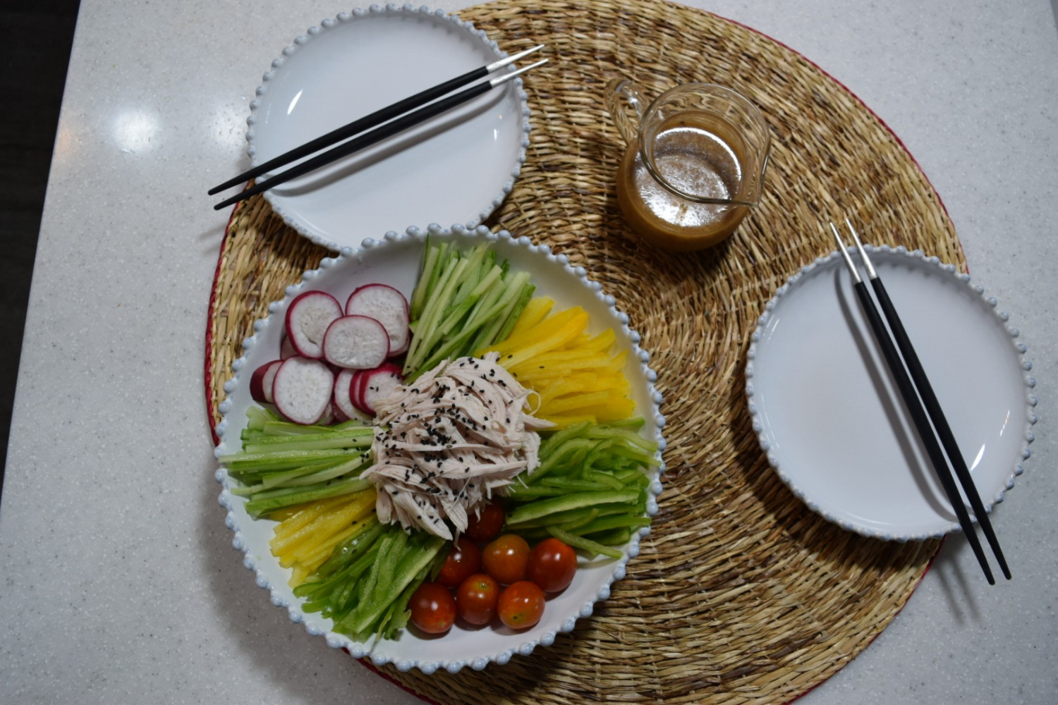 盛り付け:広めの器に、細切りにした野菜とほぐした鶏むね肉を彩りよく盛り付けます。最後に黒ごまを散らして、見た目にもアクセントを加えます。