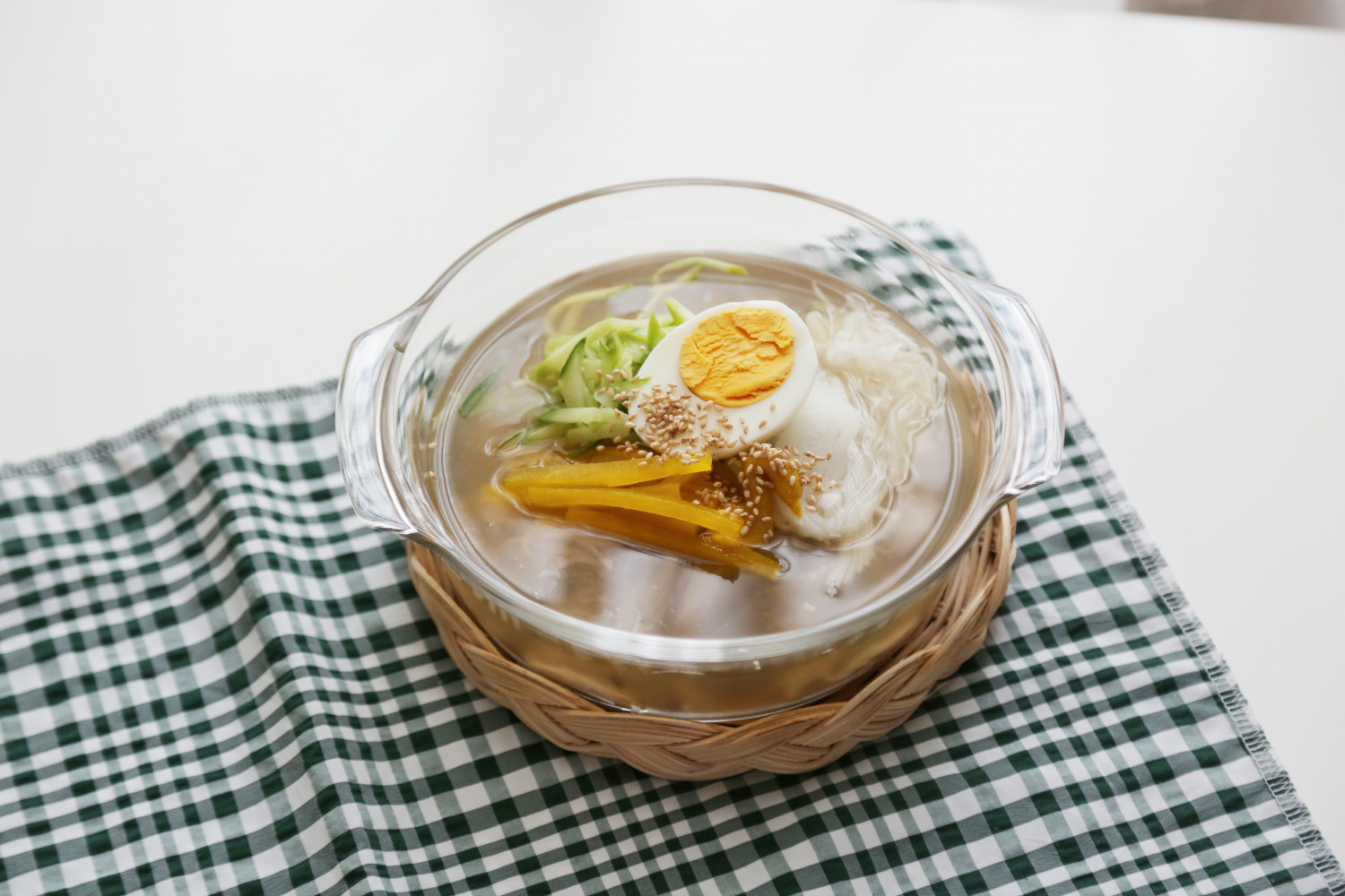 さあ、器に美しく盛り付けましょう。水気をよく切った麺を器に入れ、準備しておいた千切りきゅうり、たくあん、甘酢漬け大根を彩りよく並べます。冷やしておいたドンチミの汁300mlを麺の上から静かに注ぎ、半分に切ったゆで卵をトッピングします。最後に、お好みでからしを少し添え、白ごまを散らせば、おうちで本格的な水冷麺の完成です!