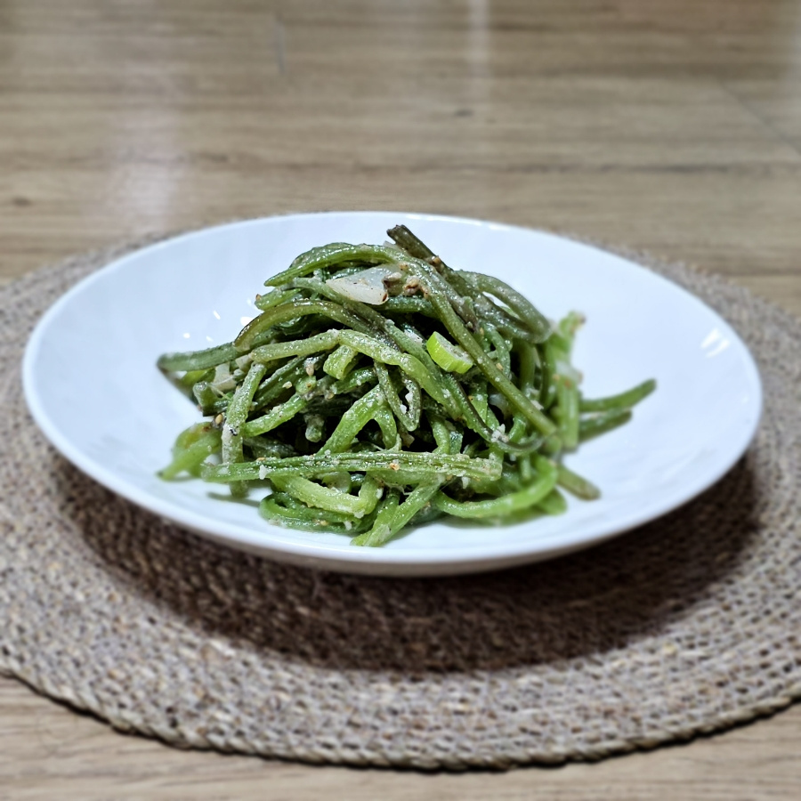 食感が楽しいさつまいもの茎と、香ばしいえごまが絶妙に調和する韓国のおかず。栄養満点で、ご飯が進むこと間違いなしの簡単レシピです。