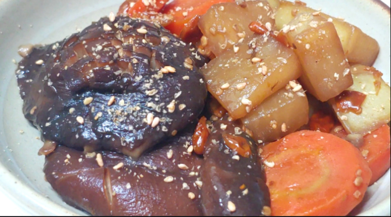 20分後、美味しい家庭料理、しいたけの煮物の完成です!しいたけのコリコリとした食感と深い旨味、そして甘く煮詰まった大根と人参が合わさり、ご飯が止まらなくなること間違いなしです。体にも良いしいたけで、健康的な食事を楽しんでください。私たちが食べるものが私たち自身を作るということを忘れずに、美味しくて健康的な食品を選ぶことが大切です。どうぞ召し上がれ!
