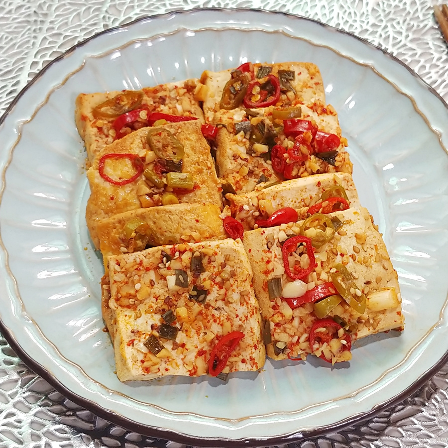 煮汁が絡んで豆腐に味が染み込んだら火を止め、準備しておいた長ネギと唐辛子を彩りに散らし、白ごまとごま油を軽く回しかけます。しょっぱくて柔らかい、絶品の基本の豆腐の煮込みが完成です!
