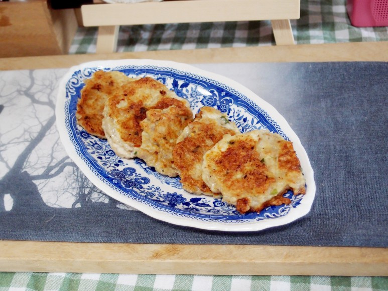 フライパンを中火で熱し、サラダ油を多めにひきます。できた生地をスプーンで取り、フライパンに落として、スプーンの背で軽く押しながら丸く平らな形に整えます。一度にたくさん乗せず、適度な間隔を空けて焼いてください。