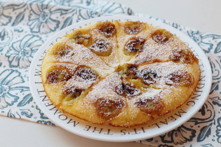 焼きあがったバナナパンケーキを、お皿にそっと盛り付けます。最後に、茶こしなどで粉糖を振りかけると、見た目も美しく、甘いバナナパンケーキの完成です!お好みでメープルシロップや生クリームを添えても美味しいですよ。