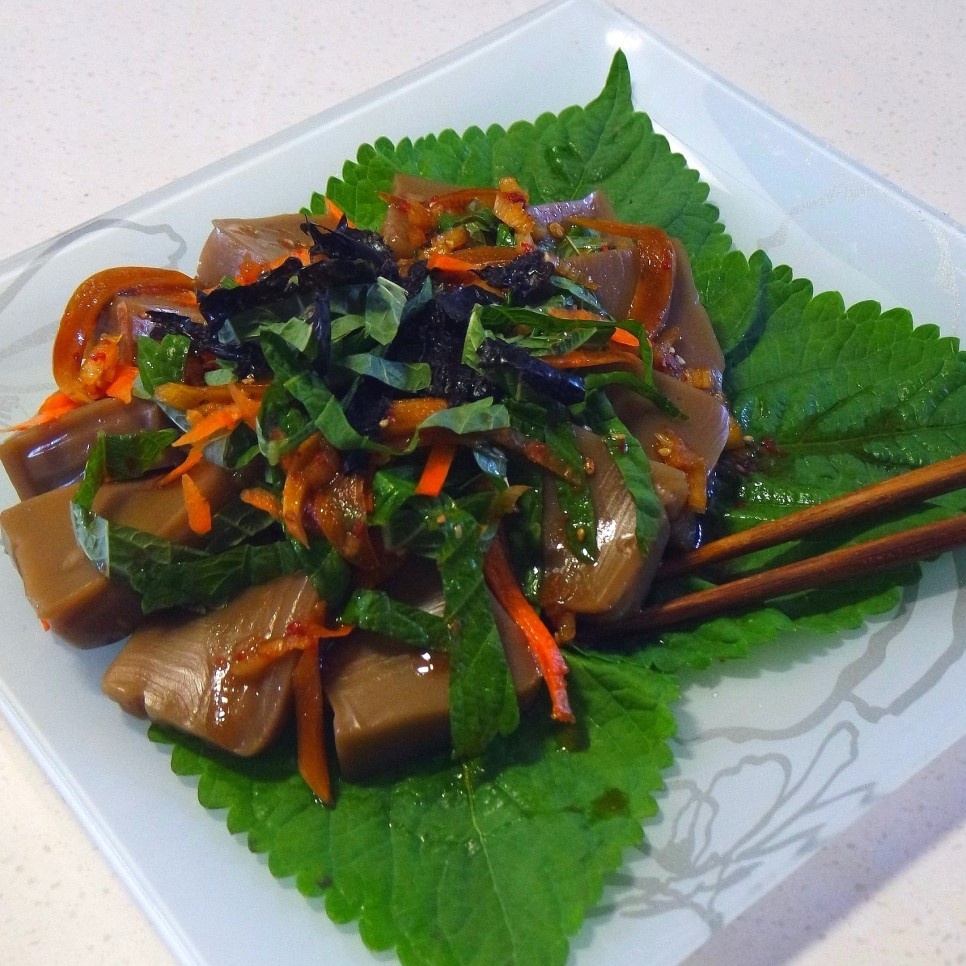 大きめのボウルかお皿に、準備したドングリゼリーを入れ、崩れないように注意しながらヘラや手で優しく和えて、ヤンニョムを全体に均一に絡ませます。細切りにしたエゴマの葉は食べやすい大きさに切ってゼリーの上にたっぷりと乗せ、焼き海苔は手で細かくちぎってたっぷり散らしましょう。これで、とろけるような美味しいドングリゼリー和えの完成です!ヤンニョムがたっぷり染み込んだ、ぷりぷりのゼリーを一口食べれば、思わず親指を立てたくなる美味しさです。春川(チュンチョン)の有名店の味にも負けませんよ。さあ、召し上がれ!素敵な一日をお過ごしください。またすぐにお会いしましょう!