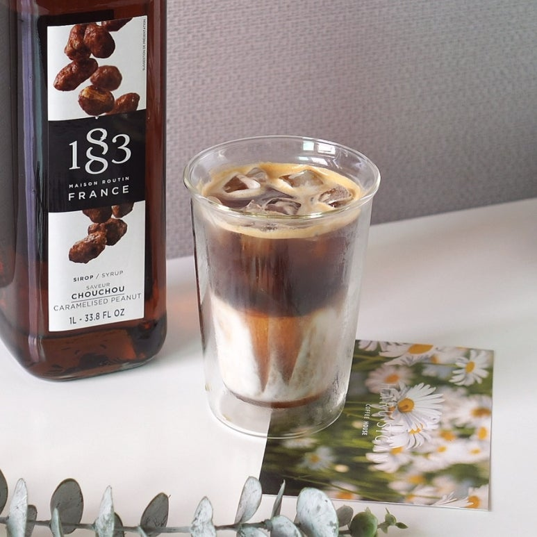 次に、グラスに入れた氷の上に、キャラメルピーナッツシロップを15g注ぎ入れます。このシロップがラテの風味の決め手!甘さはお好みで加減してくださいね。