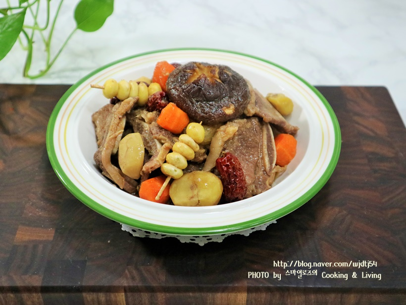 美味しく煮詰まったLAカルビチムを、器に美しく盛り付ければ、豪華なカルビチムの完成です!今回は冷凍のしいたけを使ったため、切り込みの模様が思ったように綺麗に出ず、少し残念でした。次回は新鮮なしいたけで、綺麗な切り込みを入れて飾り付けたいと思います。