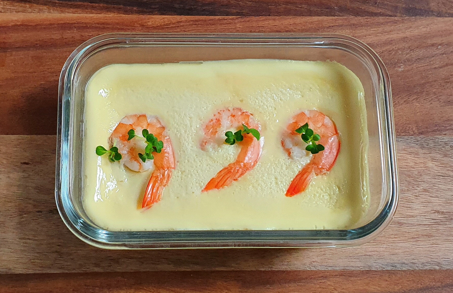 15~20分経って茶碗蒸しが少し固まってきたら、ラップをそっと開け、下処理したエビ3尾をきれいに並べます。エビは火が通るときれいな色になります。