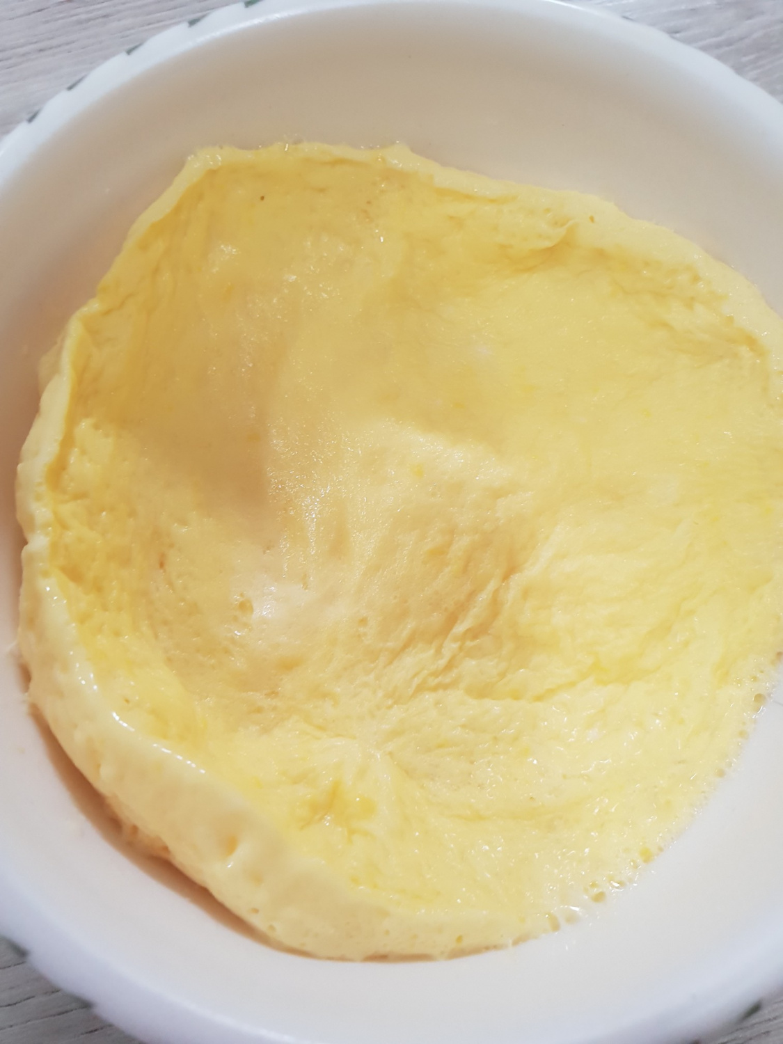電子レンジでの加熱が終わったら、完成です!このように、こんもりと膨らんだ美味しい茶碗蒸しが出来上がります。スプーンで軽く押すと、まるで雲のようにふんわりと柔らかい感触が伝わってくるはずです。器の底までしっかりと火が通っていて、とても美味しいですよ。熱々をすぐに召し上がるとさらに美味しいので、火傷に注意して、どうぞお楽しみください!