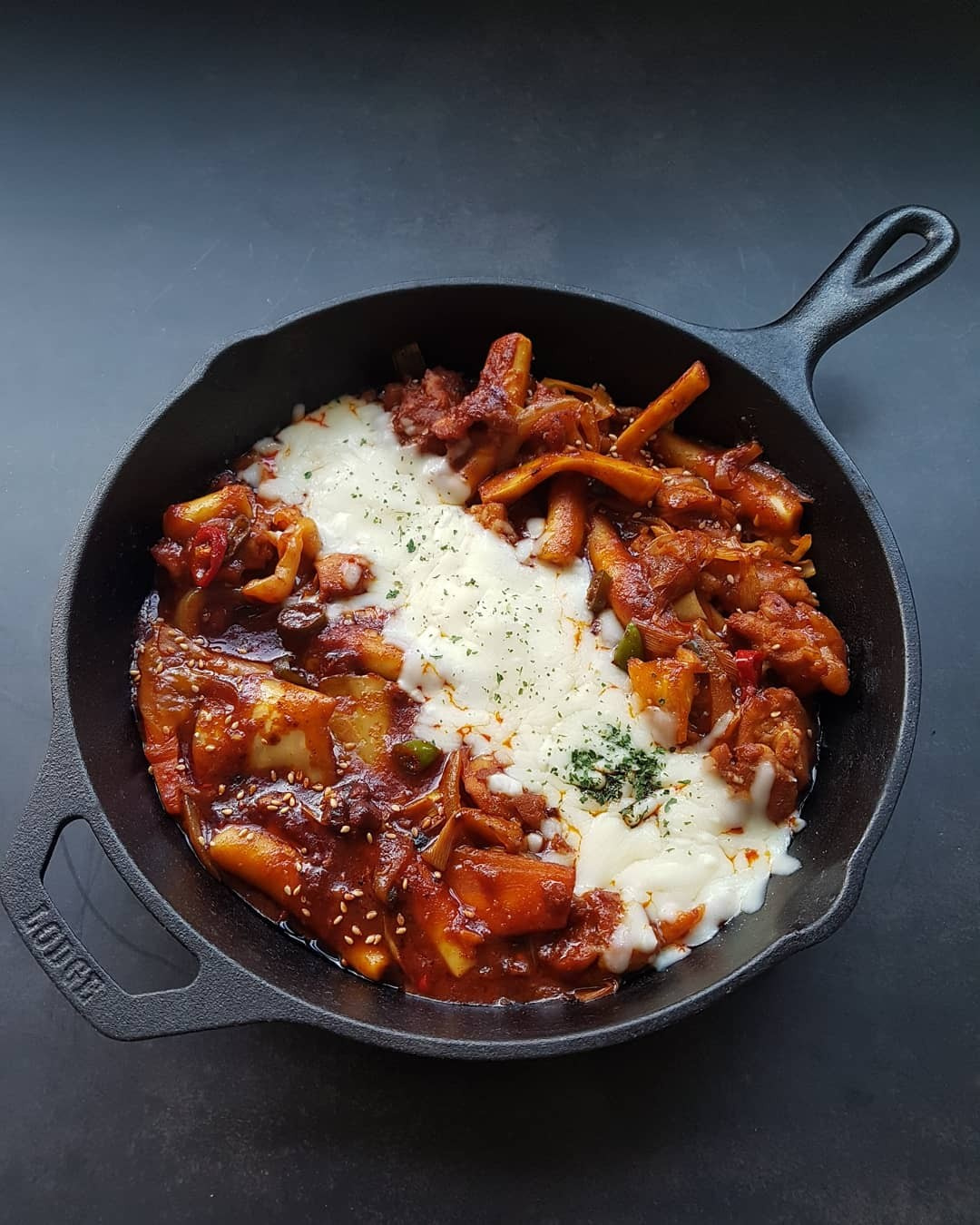 いよいよ仕上げです!この美味しそうなタッカルビの上に、たっぷりのモッツァレラチーズを広げて乗せます。蓋をして弱火にし、10分ほど蒸し焼きにすると、チーズがとろーりと溶けていきます。お好みで、乾燥パセリを散らすと、見た目も一層豪華なチーズタッカルビの完成!とろーり伸びるチーズと一緒に、熱々を召し上がれ!