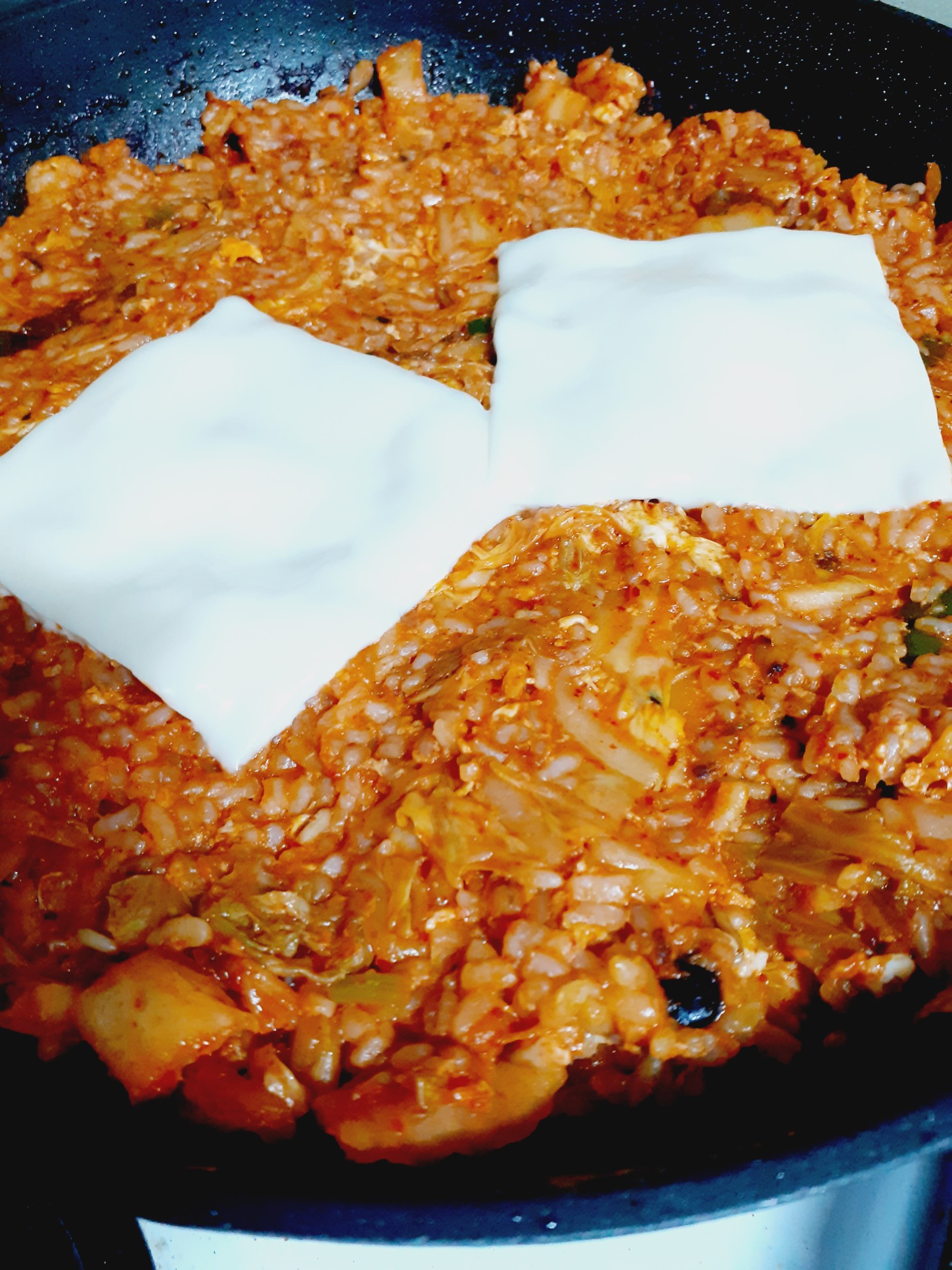 出来上がったキムチチャーハンをお皿に盛り付けます。温かいまま食べても美味しいですが、さらにおいしく楽しみたいなら、チャーハンの上にスライスチーズを2枚乗せてください。チーズがとろけてごはんと絡み合い、絶妙な美味しさを生み出します。チーズを優しく混ぜて、熱々を美味しく召し上がれ!