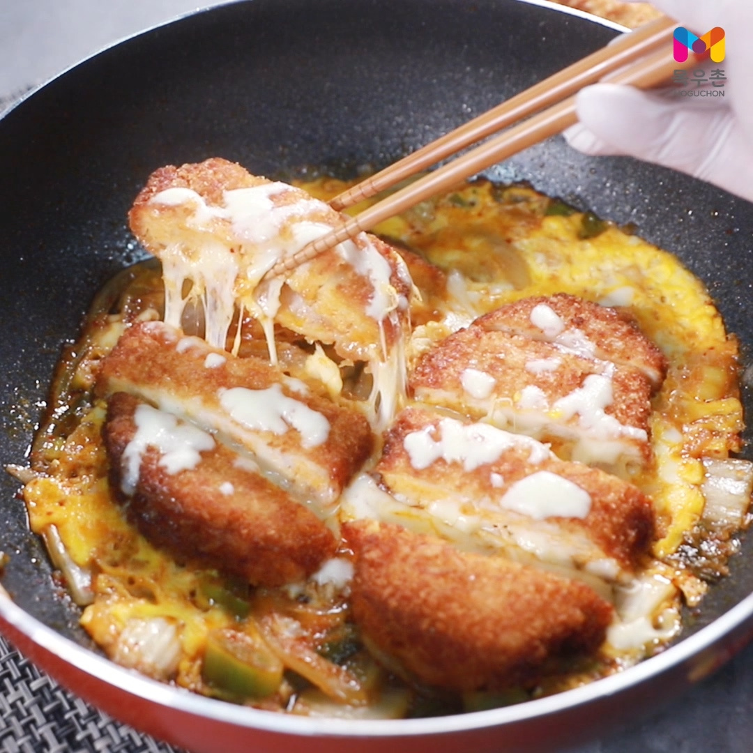 あらかじめ揚げた、またはエアフライヤーで調理したモクウチョンチーズとんかつを食べやすい大きさに切り、鍋の上にきれいに並べます。その上から準備した溶き卵を均等にかけます。弱火にして蓋をし、卵が固まるまでゆっくりと煮詰めます。こうすることで、とんかつがスープを吸って柔らかくなります。