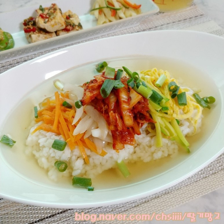 🥣 完成!美味しいキムチマリパッを召し上がれ:深さのある器に、冷やしたご飯をきれいに盛り付けます。その上に、丁寧に準備した具材(炒め野菜、卵焼きの細切り)と和えたキムチを美しく乗せてください。冷たく味を調えただし汁をたっぷり注げば、食欲をそそる最高の逸品、キムチマリパッの完成です!どうぞ召し上がれ!