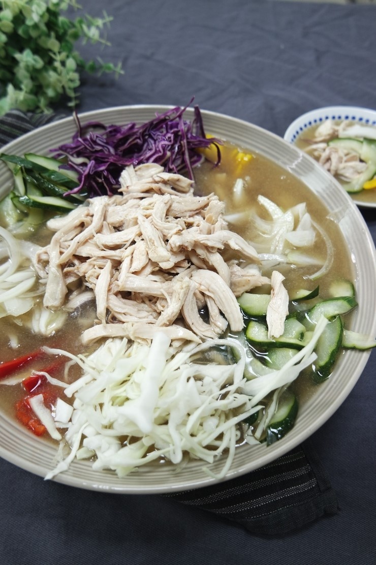 取り出した鶏肉は粗熱が取れたら、皮を取り除いてください。鶏肉のスープは、目の細かいザルなどで丁寧に濾し、澄んだ状態にします。濾したスープに韓国の醤油(국간장)でほんのり色をつけ、塩で味を調えます。次に、砂糖大さじ5と酢大さじ5を加えて、甘酸っぱい味を完成させます。味見をして、お好みで砂糖と酢の量を調整してください。完成したスープは、冷凍庫または冷蔵庫でしっかりと冷やしておきます。