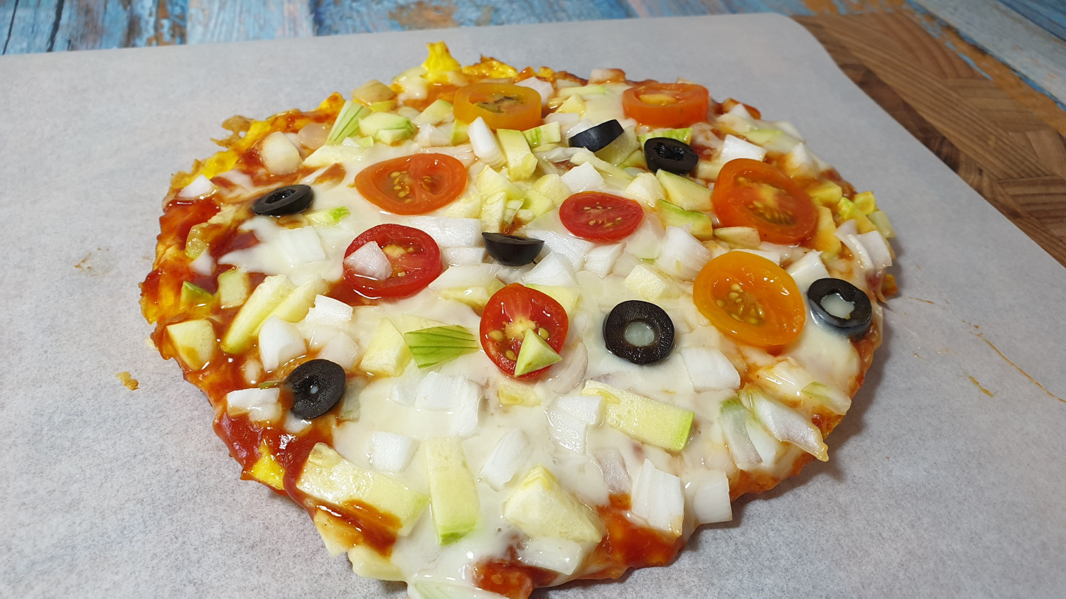 ピザの風味を豊かにするトッピング野菜を準備しましょう。玉ねぎ、ズッキーニ、ミニトマト、ブラックオリーブなど、お好みの野菜をみじん切りにします。特にズッキーニは、できるだけ細かく切ることで、弱火でじっくり火を通す際に柔らかく仕上がります。