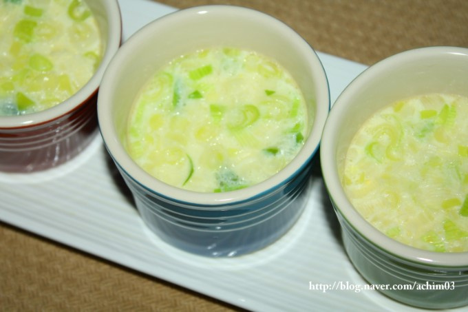 用意した蒸し器用の器(土瓶や耐熱ガラス製のものなど)に、こした卵液をそっと流し入れます。次に、小口切りにした長ねぎを卵液の上に彩りよく散らします。味付けは、エビの塩辛の汁を1/3大さじ加えて調整してください。エビの塩辛がない場合は、ナンプラーや醤油をほんの少量使用しても代用できます。