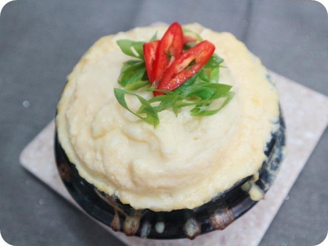 約3〜5分後、蓋を開けると、ケランチムがこんもりと膨らみ、まるで雲のようなふわふわの見た目を確認できます。蓋を開ける際は、熱い蒸気に注意してください。しゃもじなどで軽く押してみて、柔らかく入れば完成です。準備しておいた小口切りの長ネギと赤唐辛子を彩りよく散らせば、見た目も美味しいケランチムの完成です。熱々をどうぞ召し上がれ!
