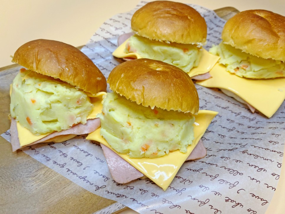 準備したモーニングパンの片面にスライスハムを乗せ、その上にチェダーチーズを重ねます。そして、あらかじめ作っておいたポテトサラダを4等分にし、パンの中に隙間なくたっぷりと詰めれば、美味しいモーニングパンのポテトサンドの完成です!