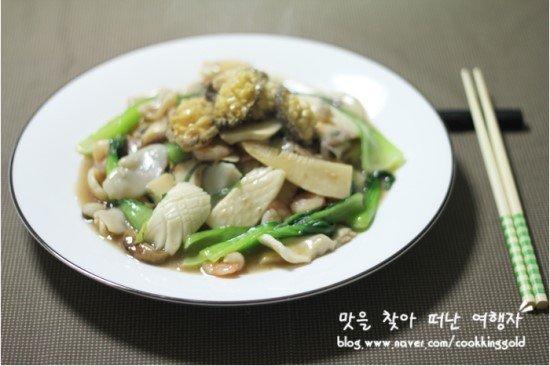 野菜がある程度炒まったら、準備した海鮮(エビ、イカ、ホタテ、アワビ)を全て加え、手早く炒めます。海鮮は火を通しすぎると固くなるので、色が変わってきたらすぐに次の工程に移るのがおすすめです。