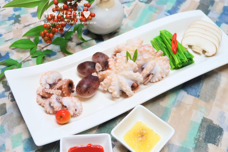 湯がきあがったタコはすぐにザルにあげて、食べやすい大きさに切ります。新鮮なセリや薄切りにした生しいたけと一緒に盛り付け、甘酸っぱいコチュジャンソースや香ばしいごま油塩だれを添えていただけば、豪華で美味しいタコ料理が楽しめます。(ポイント:さらにプリッとした食感を求める場合は、湯がきあがったタコをすぐに氷水で冷やすと良いでしょう。これはお好みで調整してください。)